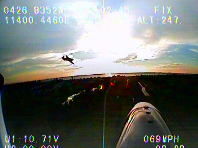 The plane was suitable for short distance circuit flight best for friendly air to air dog fight and chasing. Equipped with modded 270 degree HXT 900 servo pan i could view my friends plane and chase them around the field all round my wings just like watching my allied wingmen at the end of my wing tip. Attached are some fantastic snapshots how the view would looked like from FPV point of view. I'll also be posting the recorded FPV video scene soon about dog figting and combat formation at our local field. This should be an exciting FPV experience. Once again proud to be R/C pilot. Everyday is an adventure up in the air.
